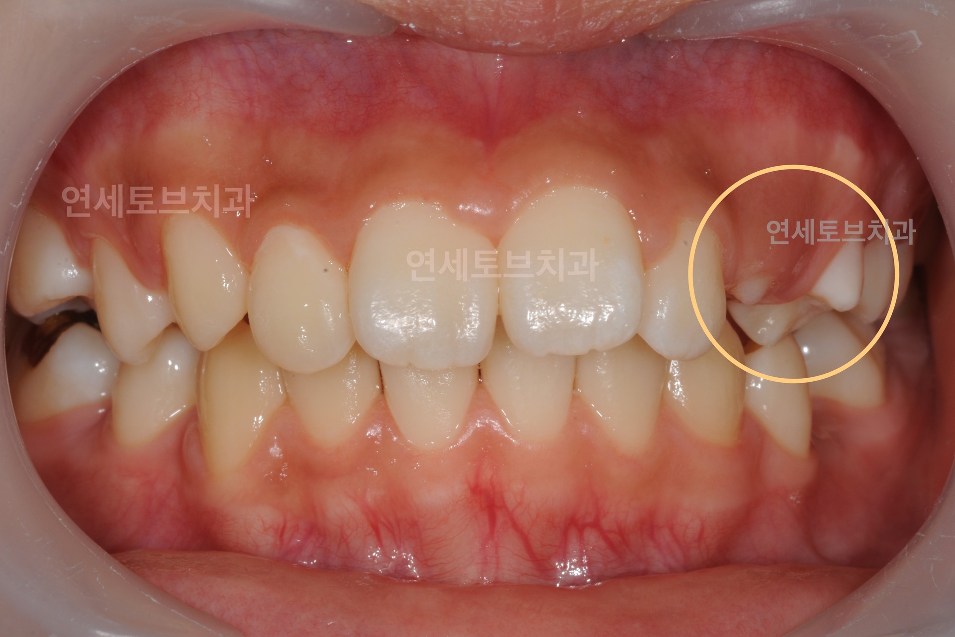 미니스크류(교정용 임시 고정원)를 잇몸에 식립하여 상악 전치를 효과적으로 함입시킵니다.